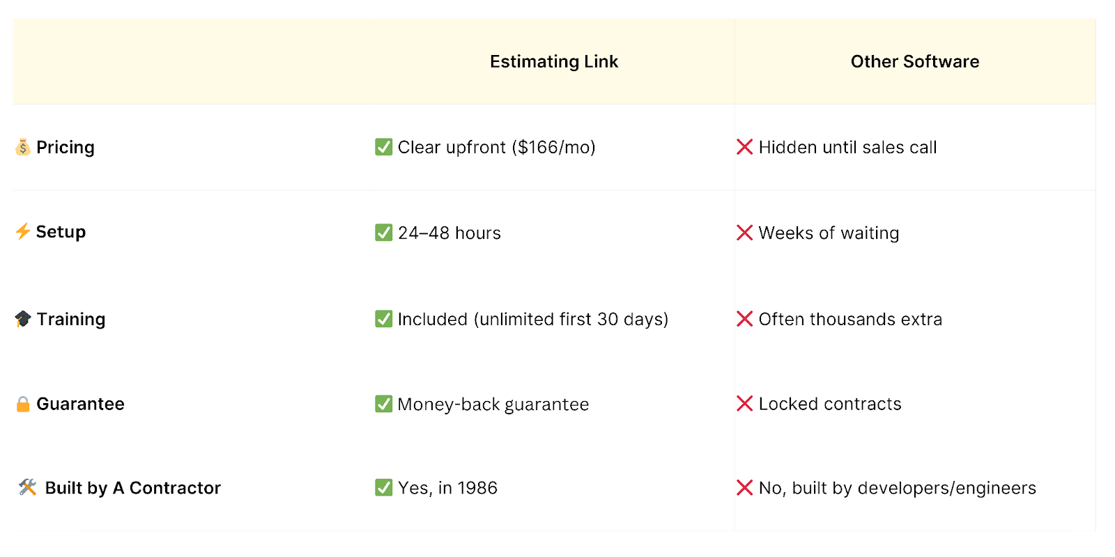 Most importantly, our pricing reflects who we are. Estimating Link was founded by a contractor in 1986 for contractors, built on the same principles you run your jobs with: clarity, fairness, and no wasted time.