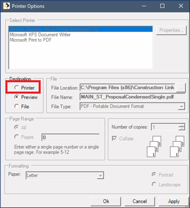 - In the Print Options window, select Printer as the Destination, the click OK. (The default is "Preview.")