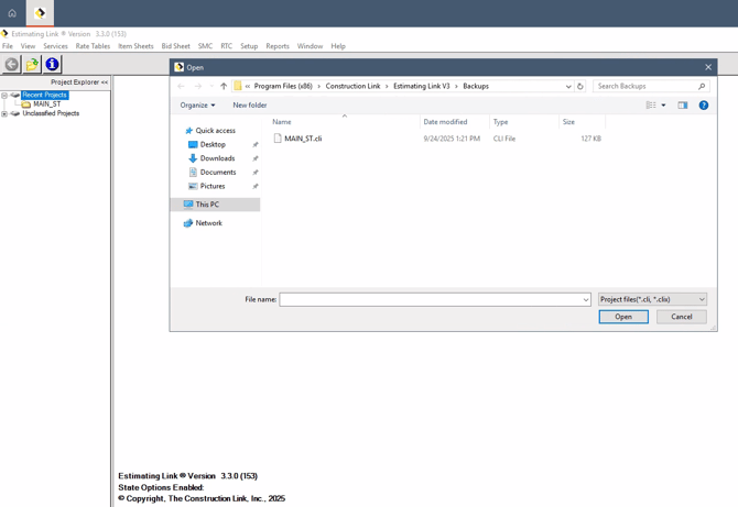 - In this example, I will restore a project. Importing a State Project or a Spreadsheet will work in the same manner. A window will open and by default will direct you to C:\Program Files (x86)\Construction Link\Estimating Link V3\Backups.