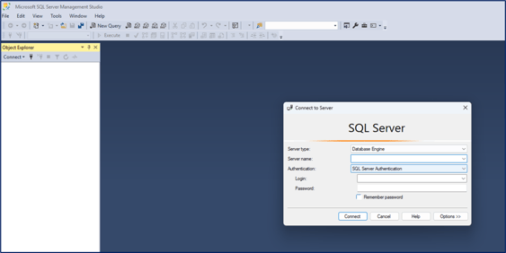 Open SQL Management Studio by pressing Windows + R, typing SSMS.exe, and pressing Enter, or by clicking the SQL Management Studio icon and login with your SQL credentials.