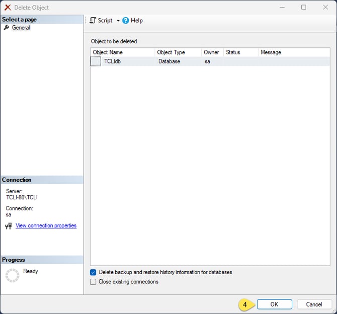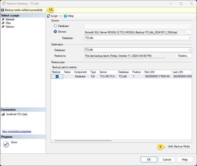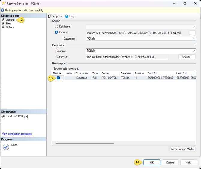 - Go to General, Verify the Restore Checkbox is checked and click OK