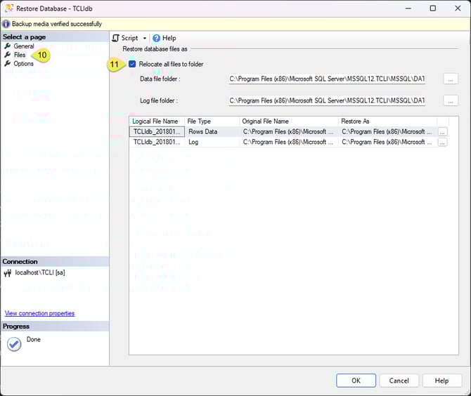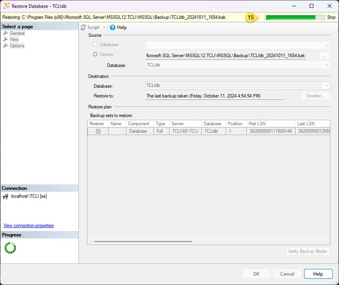 The backup file will be saved on the old server at C:\Program Files (x86)\Microsoft SQL Server\MSSQL12.TCLI\MSSQL\Backup and named similarly to TCLIdb_YYYYMMDD_HHMM.bak.