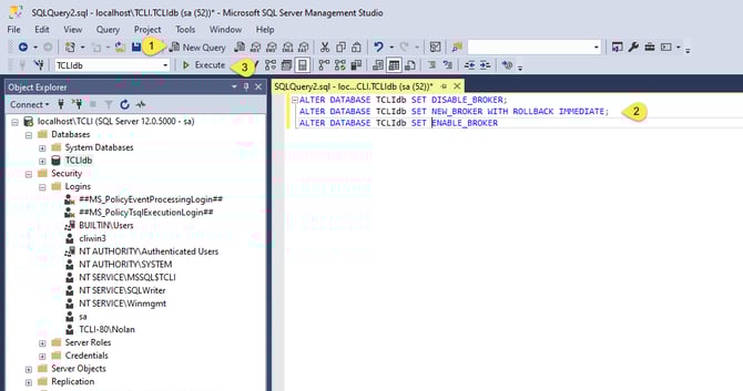 ALTER DATABASE TCLIdb SET DISABLE_BROKER;ALTER DATABASE TCLIdb SET NEW_BROKER WITH ROLLBACK IMMEDIATE;ALTER DATABASE TCLIdb SET ENABLE_BROKER